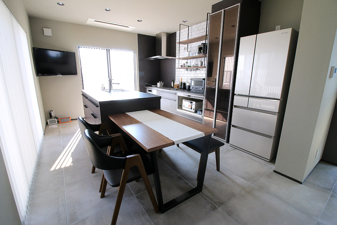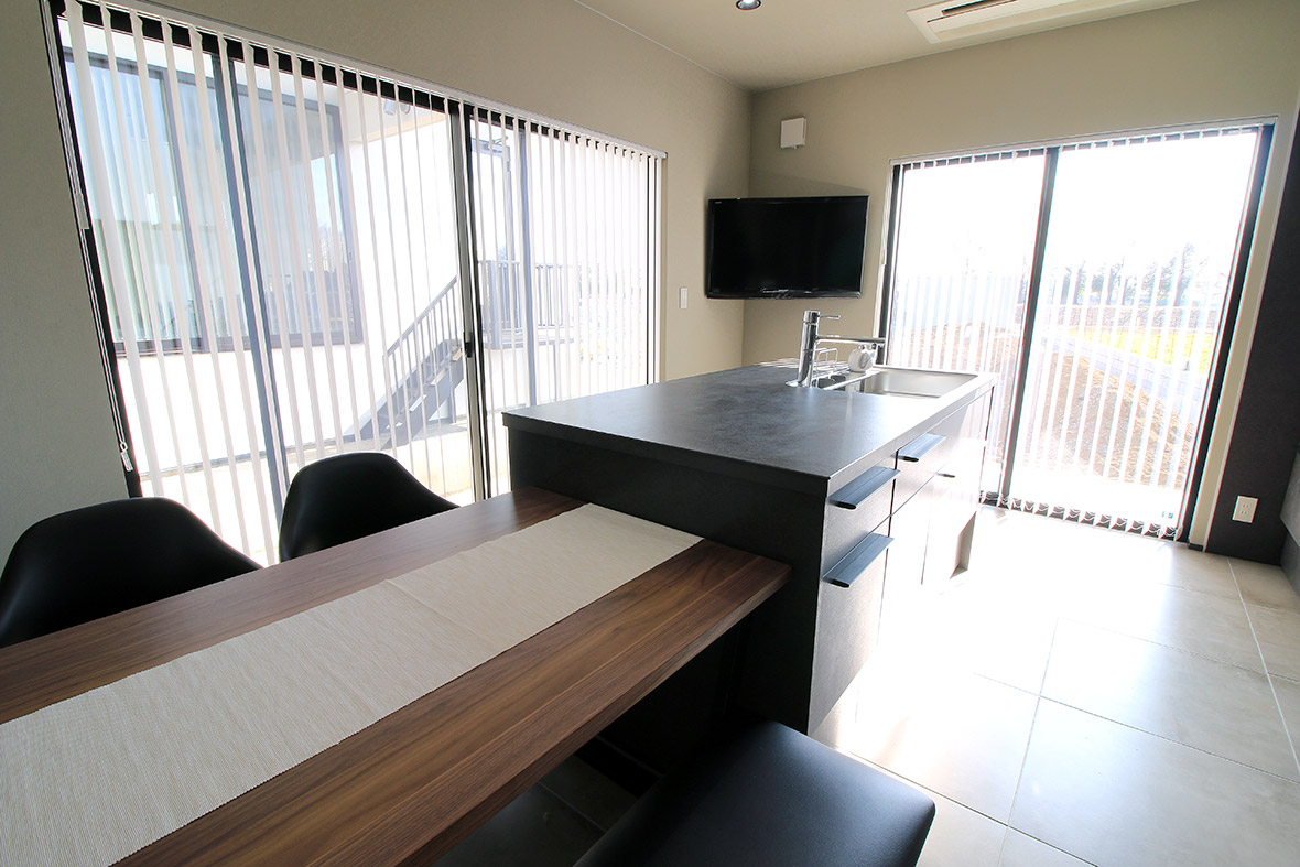 また、本来は役割の違うリビングとダイニング・キッチン。こちらのモデルハウスではリビングとダイニング・キッチンの間に大きな窓を入れることでお互いを視野に捉えつつ空間を切り離しております。これにより一体感を得ながらもキッチンの音や臭いを気にすることなくリビングで寛ぐことができます。意識的にゾーン分けをすることでそれぞれの違った魅力が引き立ち、また家族一人ひとりの「個」が尊重されることで、心から落ち着ける最高の安らぎの場になると思うのです。