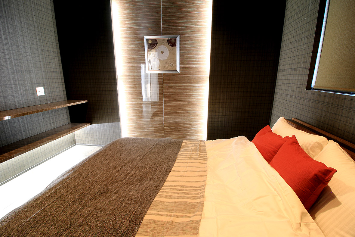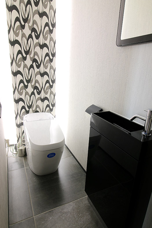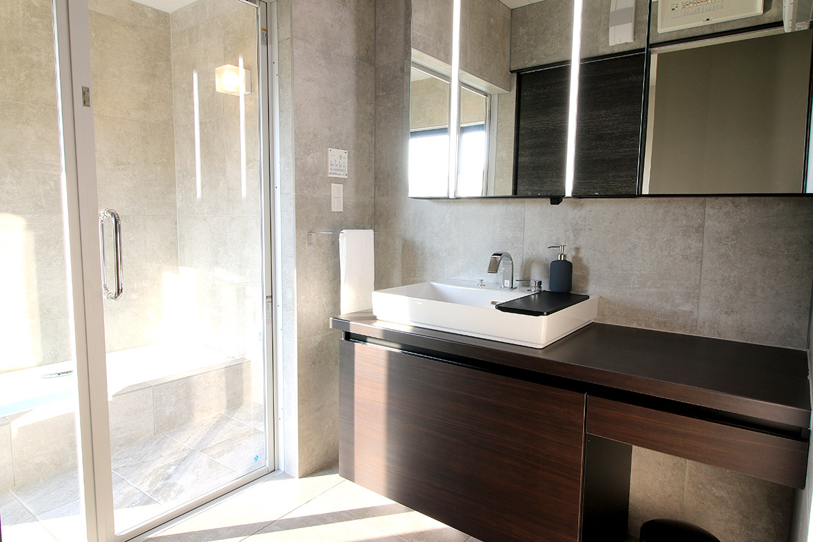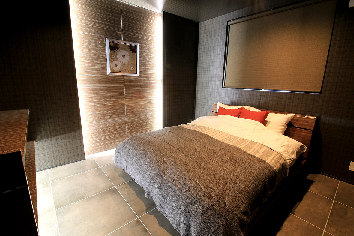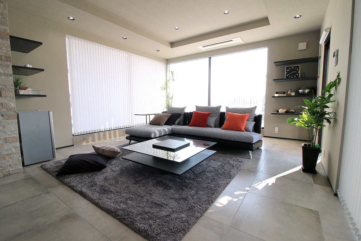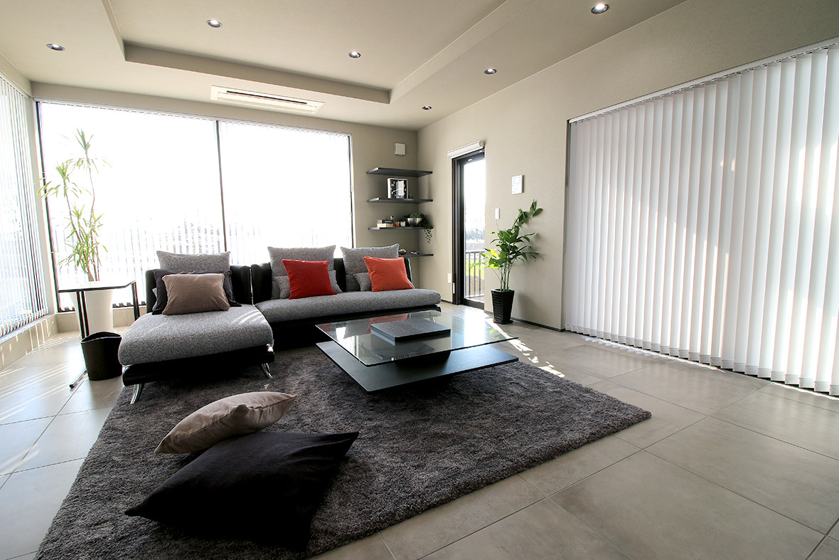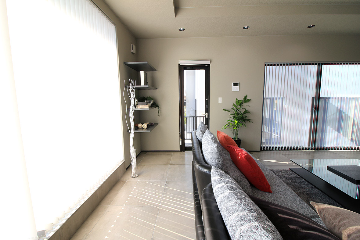 スクエア型に「白」・「黒」を基調としたモダンな外観。心地よい陽の光をたっぷりと降り注いでくれる開放的な大きな窓が特徴のリビング。間接照明の穏やかな光と落ち着いたカラーコーディネートで大人な空間に仕上げた寝室。全体的に室内を白、黒、グレーのシックなトーンでまとめ、床はスタイリッシュなタイルにしているので、まるでホテルにいるような上質で贅沢な暮らしを堪能できます。