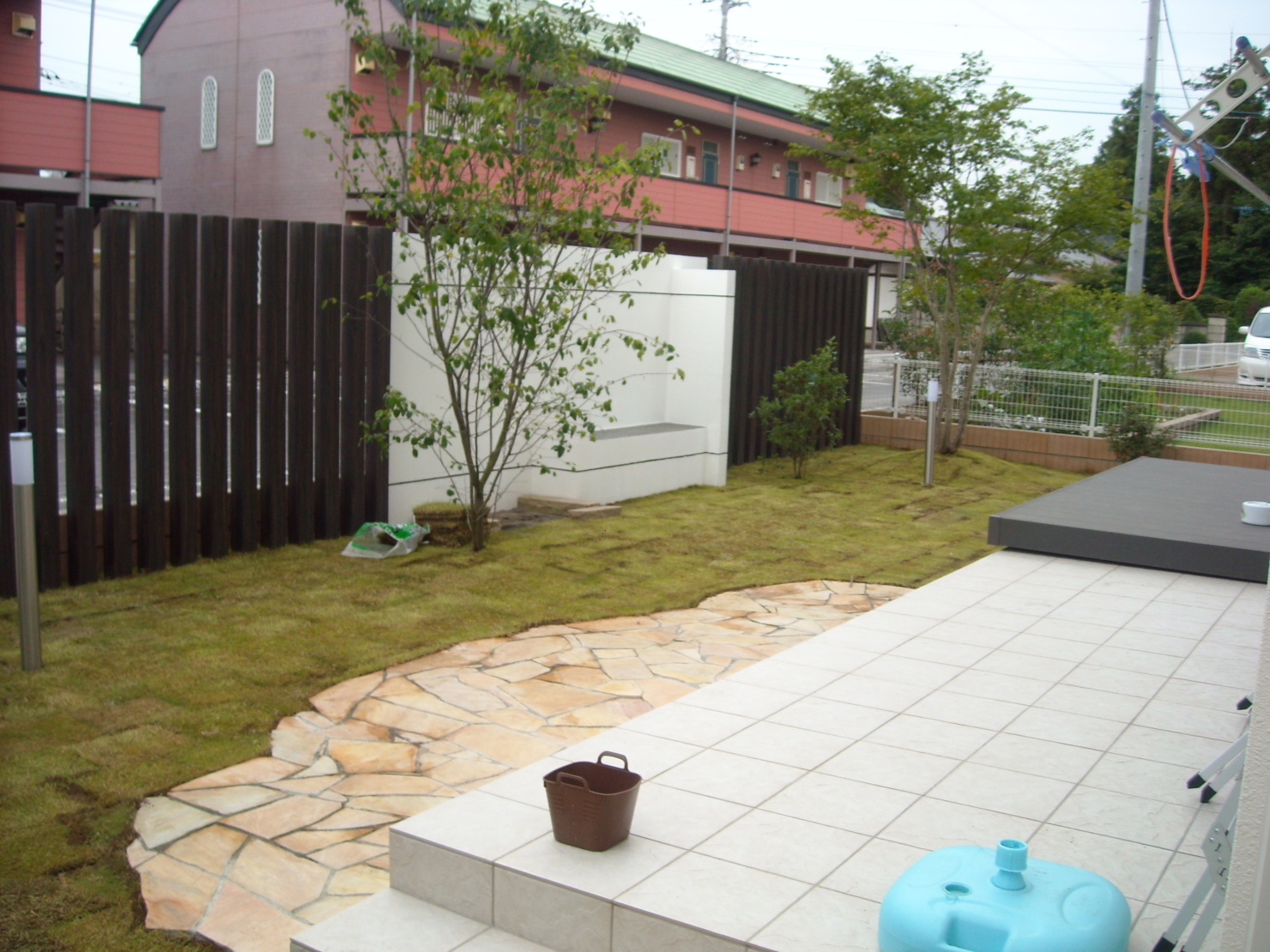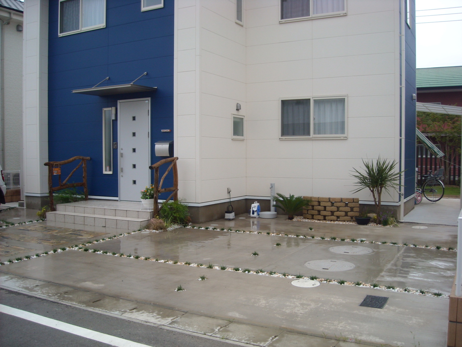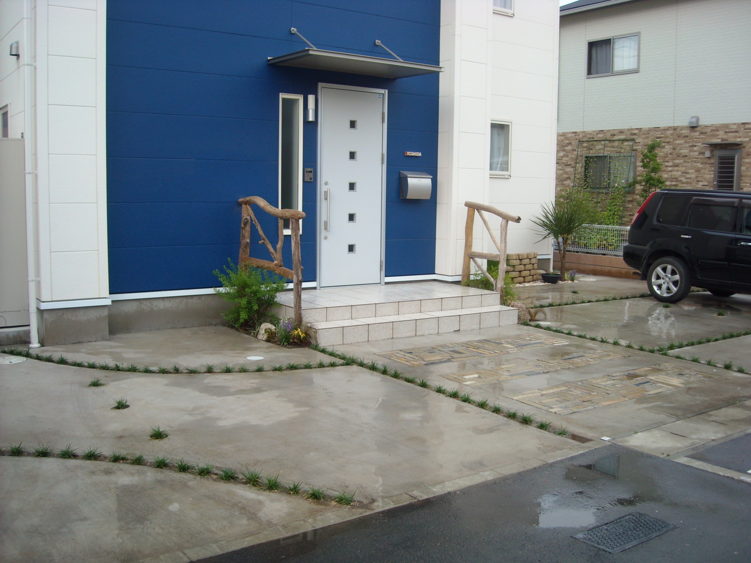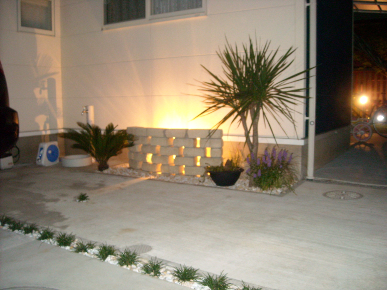 外からの視界を防ぎつつ癒しの空間もあるバックヤード。 ウッドデッキと対面できるよう壁にはベンチを設けモザイクタイルで仕上げました。 玄関には流木で作った手摺を設け、駐車場には自然石、約4台駐車できるよう設計しました。 やはりライトアップがお庭を引き立てますね。