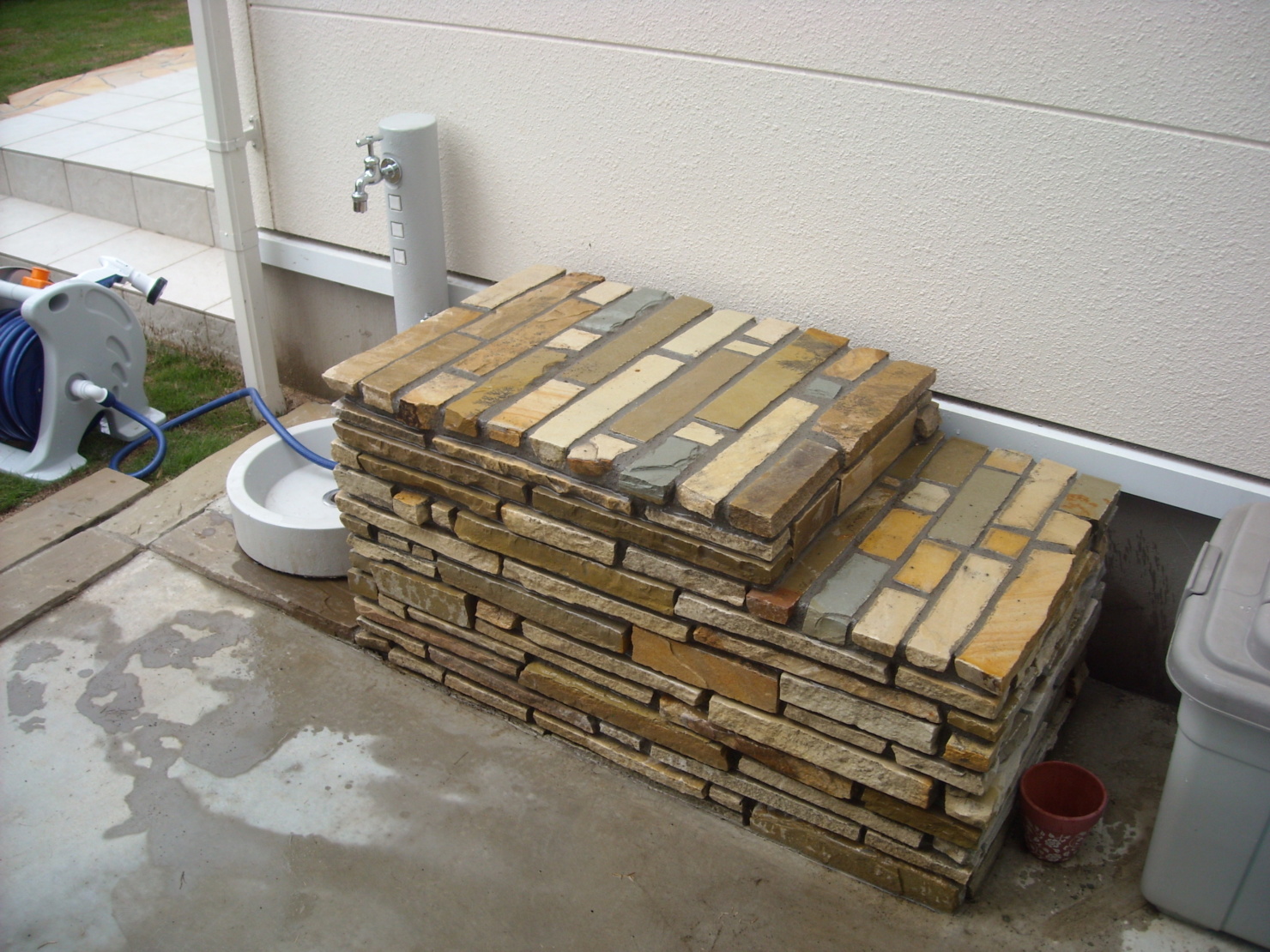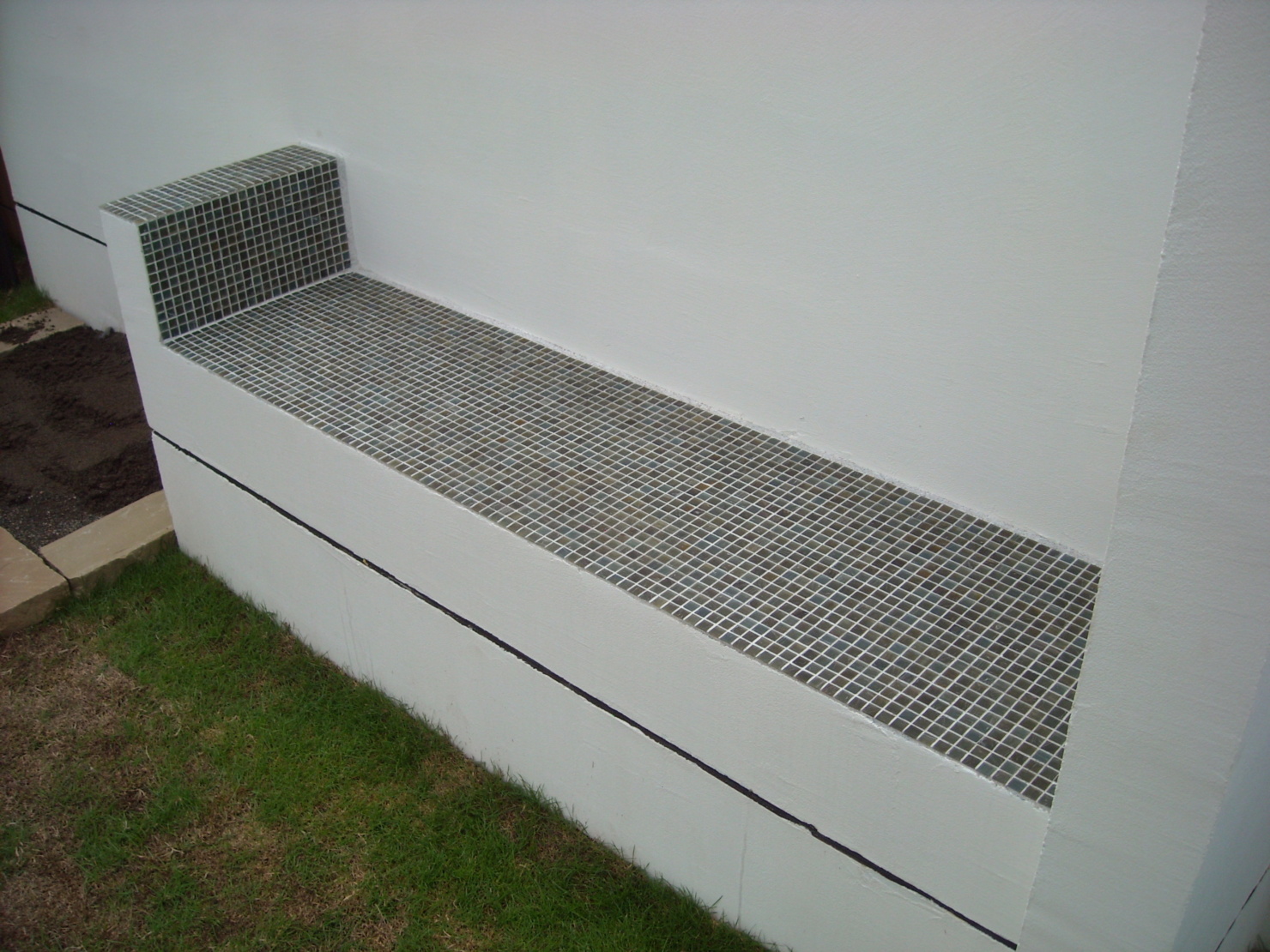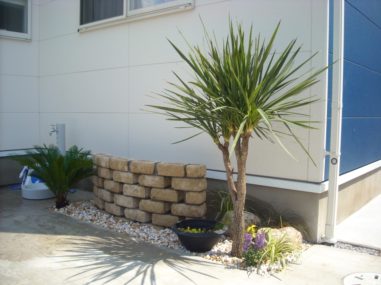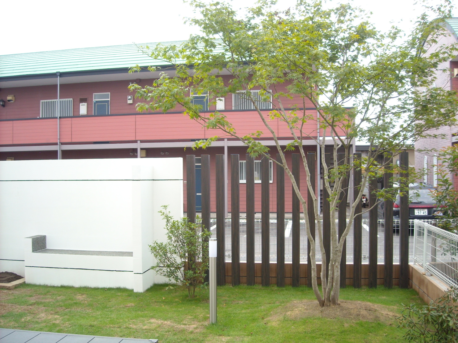 外からの視界を防ぎつつ癒しの空間もあるバックヤード。 ウッドデッキと対面できるよう壁にはベンチを設けモザイクタイルで仕上げました。 玄関には流木で作った手摺を設け、駐車場には自然石、約4台駐車できるよう設計しました。 やはりライトアップがお庭を引き立てますね。