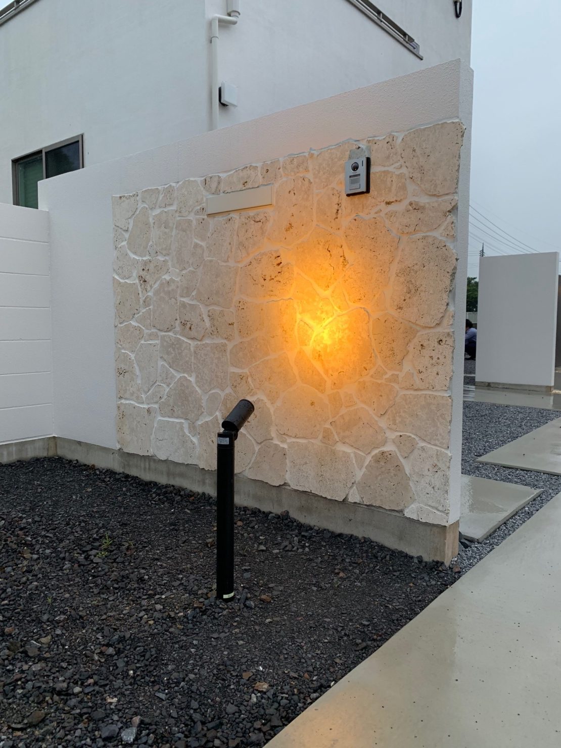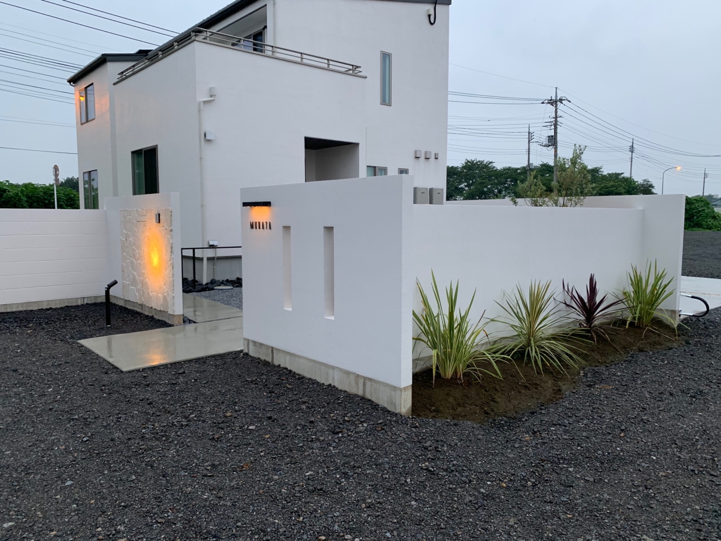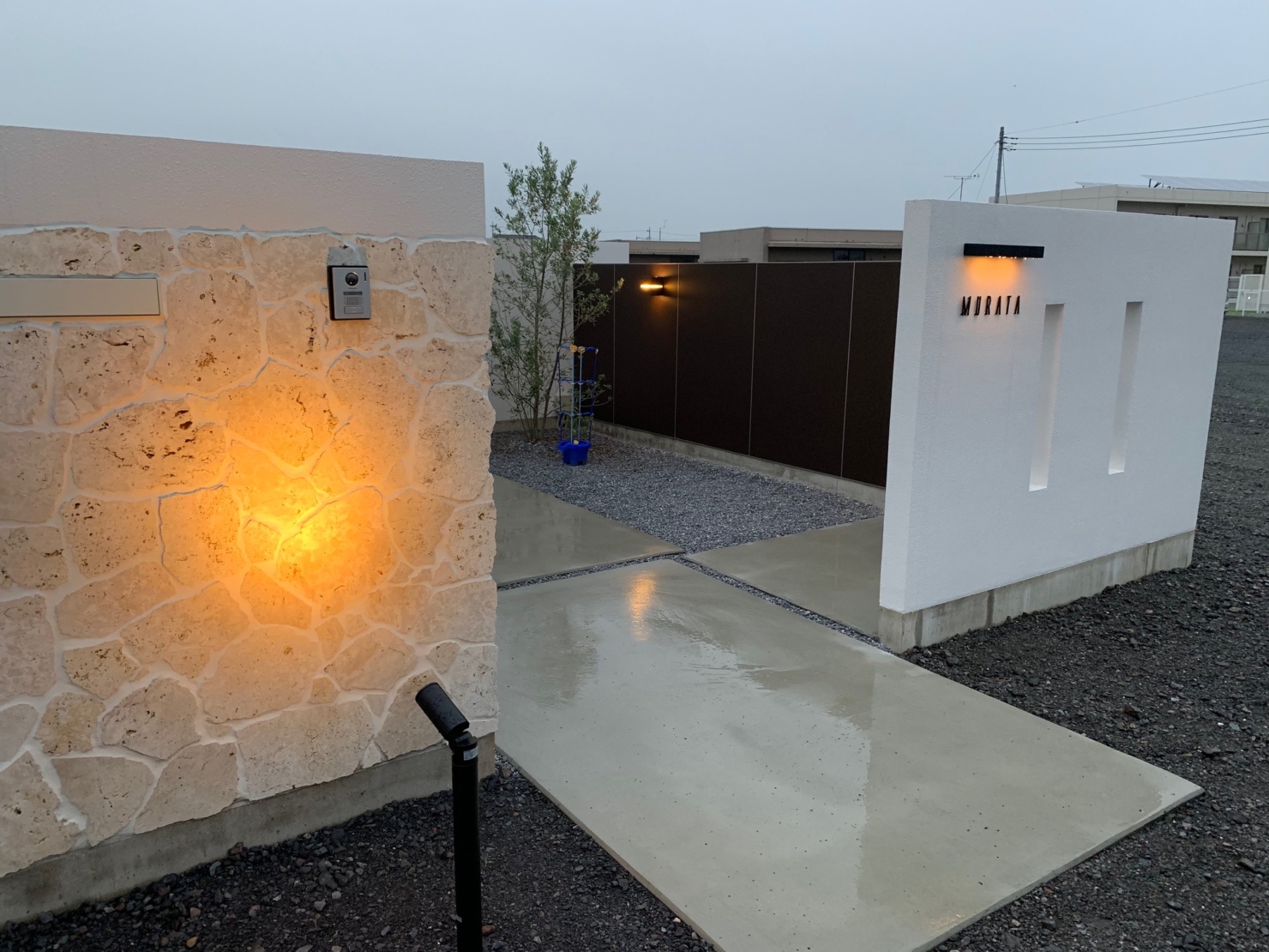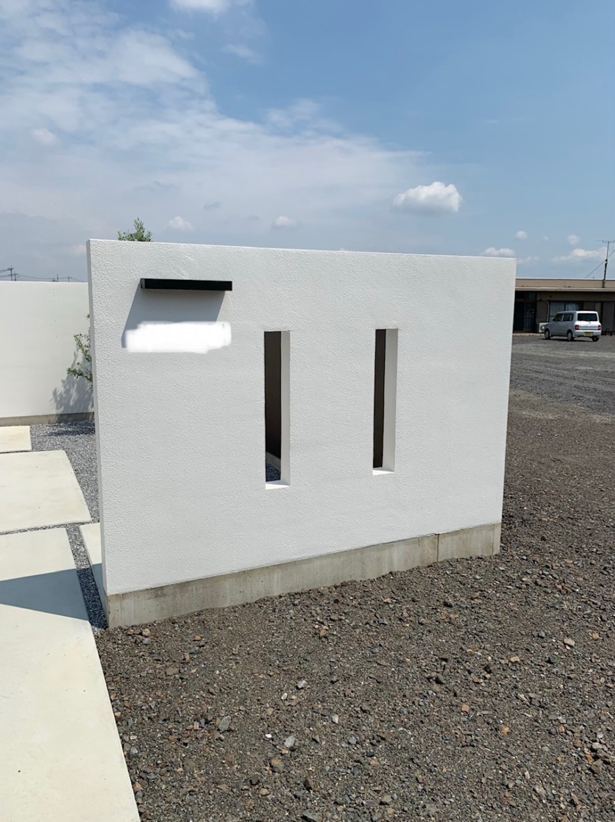 白で統一された建物に外構も同色でまとめました。エントランスには沖縄の琉球石を張り付け、切り文字のサインでシンプルに。 内側には自転車置き場と植栽、中庭と駐車場の壁には石目調を施したアルミの板を張り付けブラケットライトで夜の顔も演出してみました^^ こんな豪華な外構、帰ってくるたびに癒されちゃいますね。