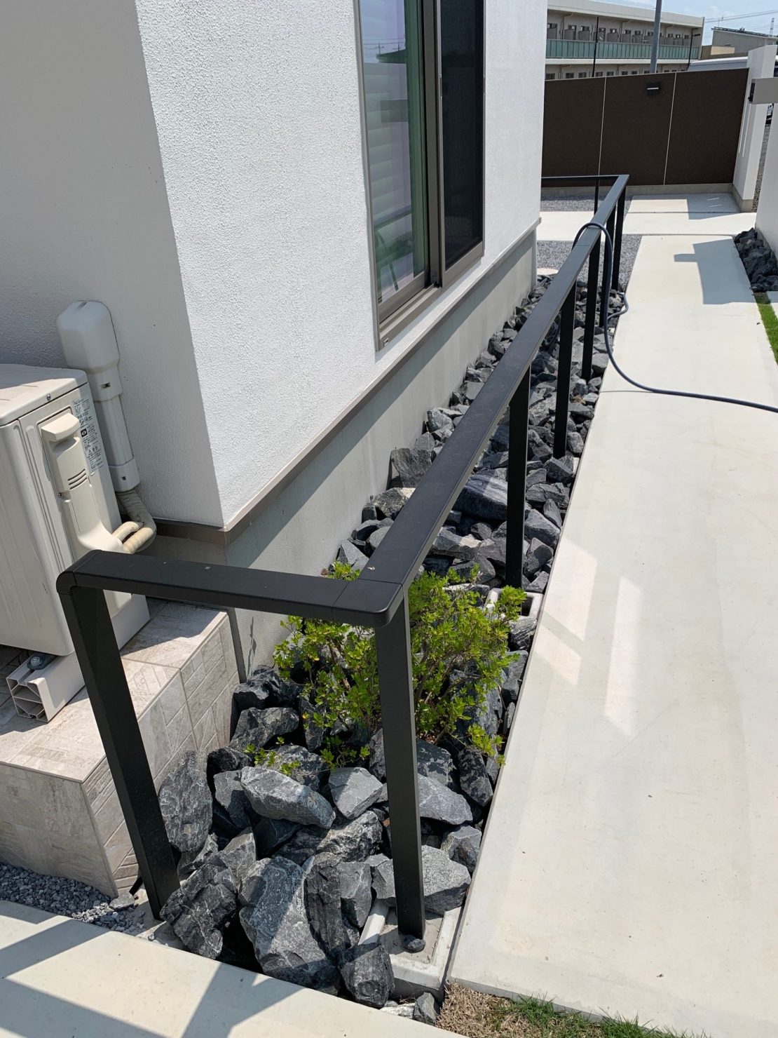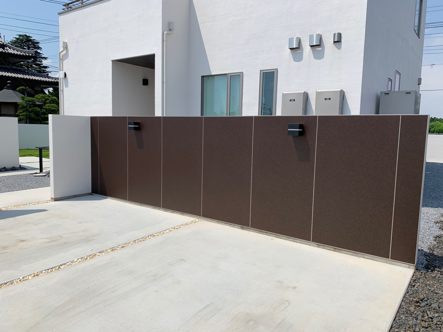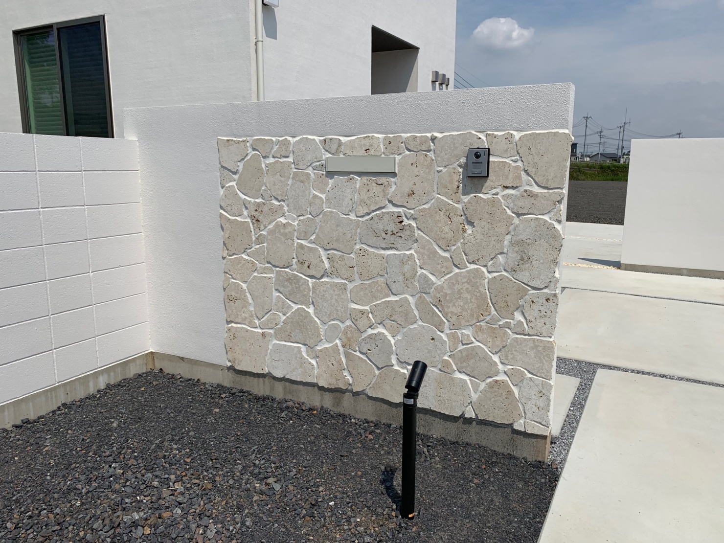 白で統一された建物に外構も同色でまとめました。エントランスには沖縄の琉球石を張り付け、切り文字のサインでシンプルに。 内側には自転車置き場と植栽、中庭と駐車場の壁には石目調を施したアルミの板を張り付けブラケットライトで夜の顔も演出してみました^^ こんな豪華な外構、帰ってくるたびに癒されちゃいますね。