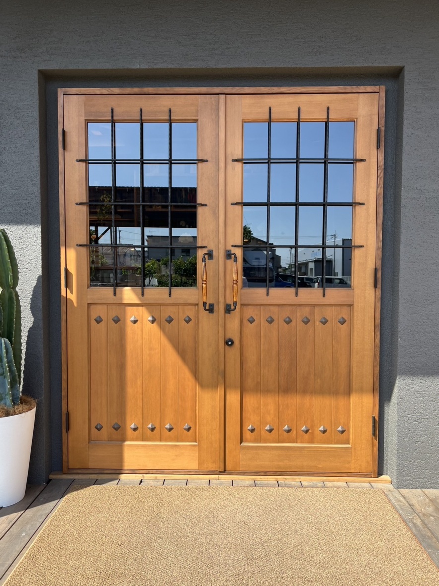 無垢材を使用したキッチンは木材の使い方や配置が魅力的で、木材製造、加工、販売を行う会社ならではのこだわりの仕上がりです。フルオーダーのドアも見どころです。